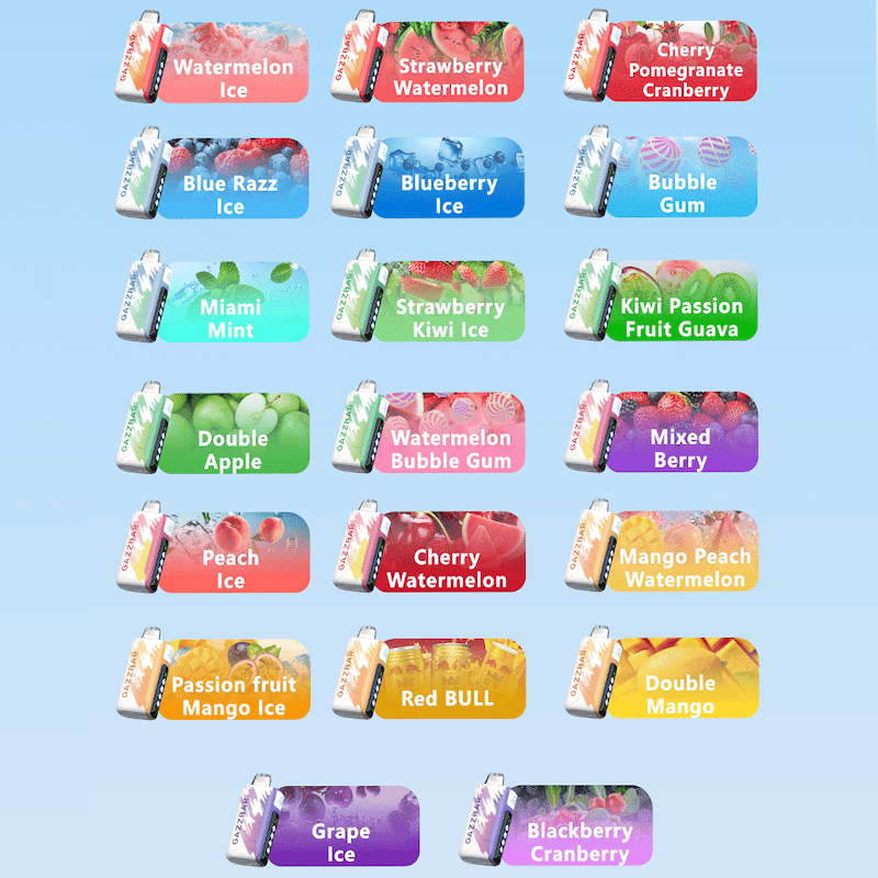 Twenty diverse flavors ensure the Gazzbar Ice God 50000 satisfies virtually any taste preference, from classic ice variants like Watermelon Ice and Blue Razz Ice to unique combinations like Cherry Pomegranate Cranberry and Kiwi Passion Fruit Guava. This comprehensive selection maximizes inventory turnover by covering all major flavor categories that drive consistent sales.